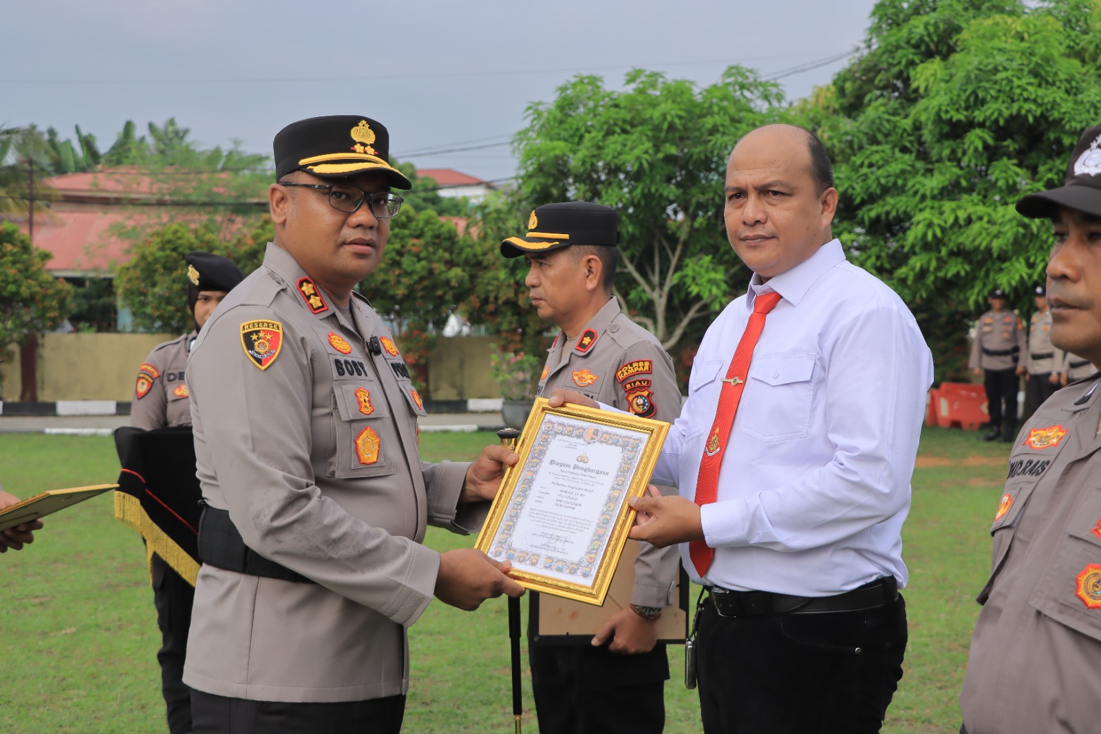 Kapolres Kampar dalam amanatnya menyampaikan ucapan selamat kepada para personel yang mendapat penghargaan ini.