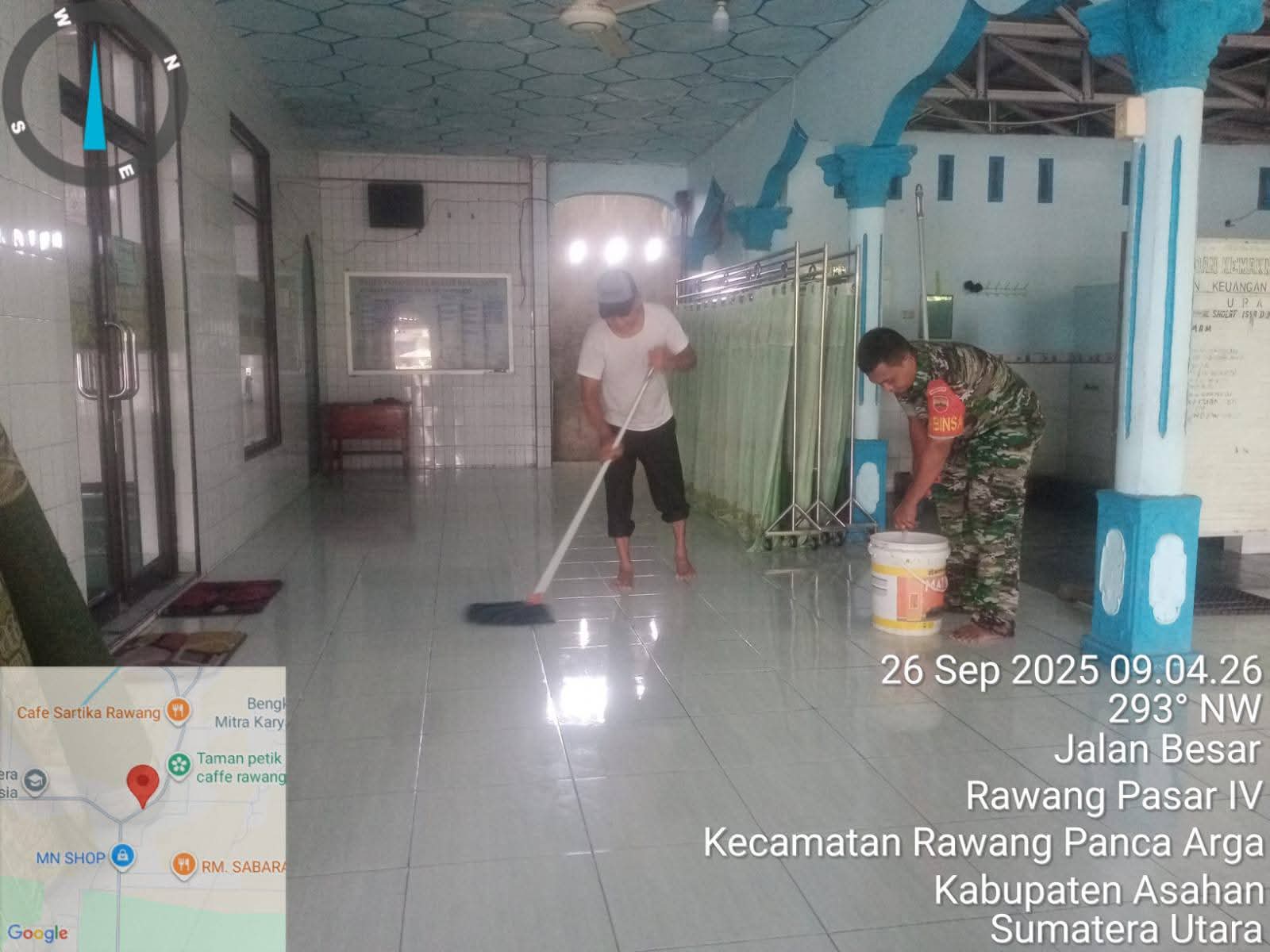 Asahan |Topannews.com- Dalam rangka menjaga hubungan harmonis dengan masyarakat binaan sekaligus memperingati HUT ke-80 TNI, Kopda Dedi Susanto, Babinsa Koramil 18/Meranti Kodim 0208/Asahan melaksanakan kegiatan Bakti Teritorial Prima Jumat Bersih di Masjid Dusun VIII Desa Rawang Pasar IV, Kecamatan Rawang Panca Arga, Jumat (26/9/2025).