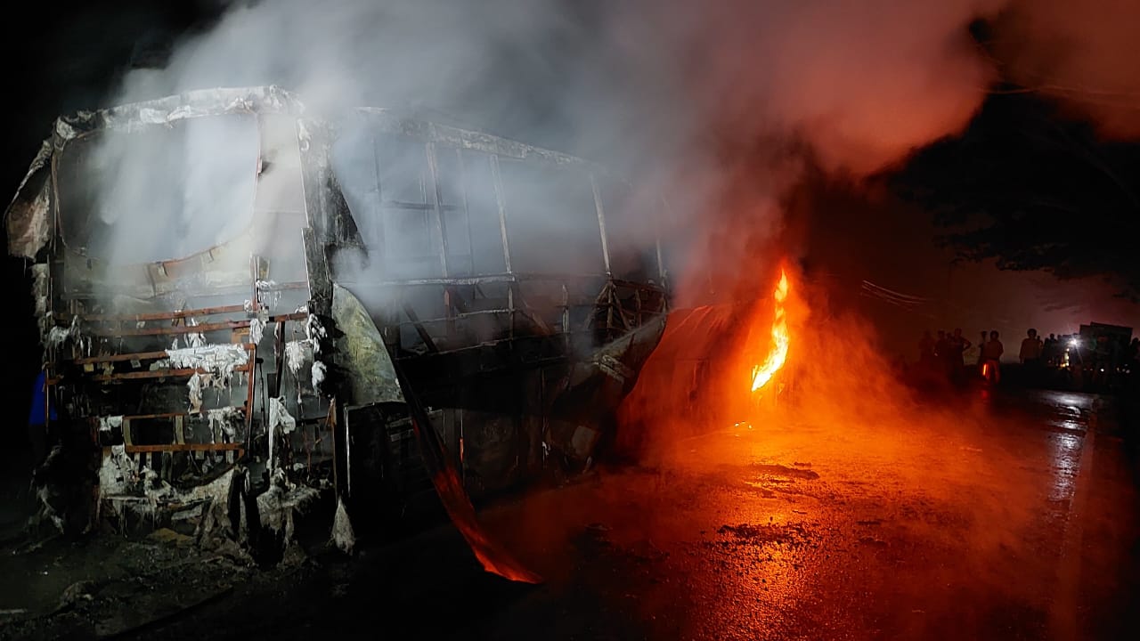 Menurut keterangan, pengemudi bus bernama Natanail Bukit awalnya mencium bau asap dari dalam kabin kendaraan. Ia kemudian menghentikan bus dan melakukan pemeriksaan. Saat dicek, terlihat asap pekat disertai kobaran api di bawah tangki minyak. Dalam waktu singkat, api membesar dan membakar seluruh bagian kendaraan.