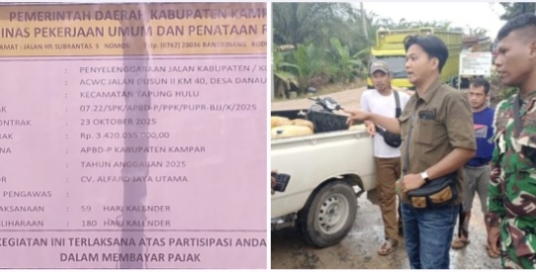 Diketahui, berdasarkan papan informasi proyek, pengaspalan jalan ini dikerjakan oleh rekanan kontraktor CV Alvaro Jaya Utama (AJU), sumber anggaran APBD-P Kabupaten Kampar tahun 2025, besaran anggaran senilai Rp 3.420.055.000,00 (tiga miliyar, empat ratus dua puluh juta lima puluh lima ribu Rupiah), dan tidak memiliki identitas konsultan pengawas proyek.